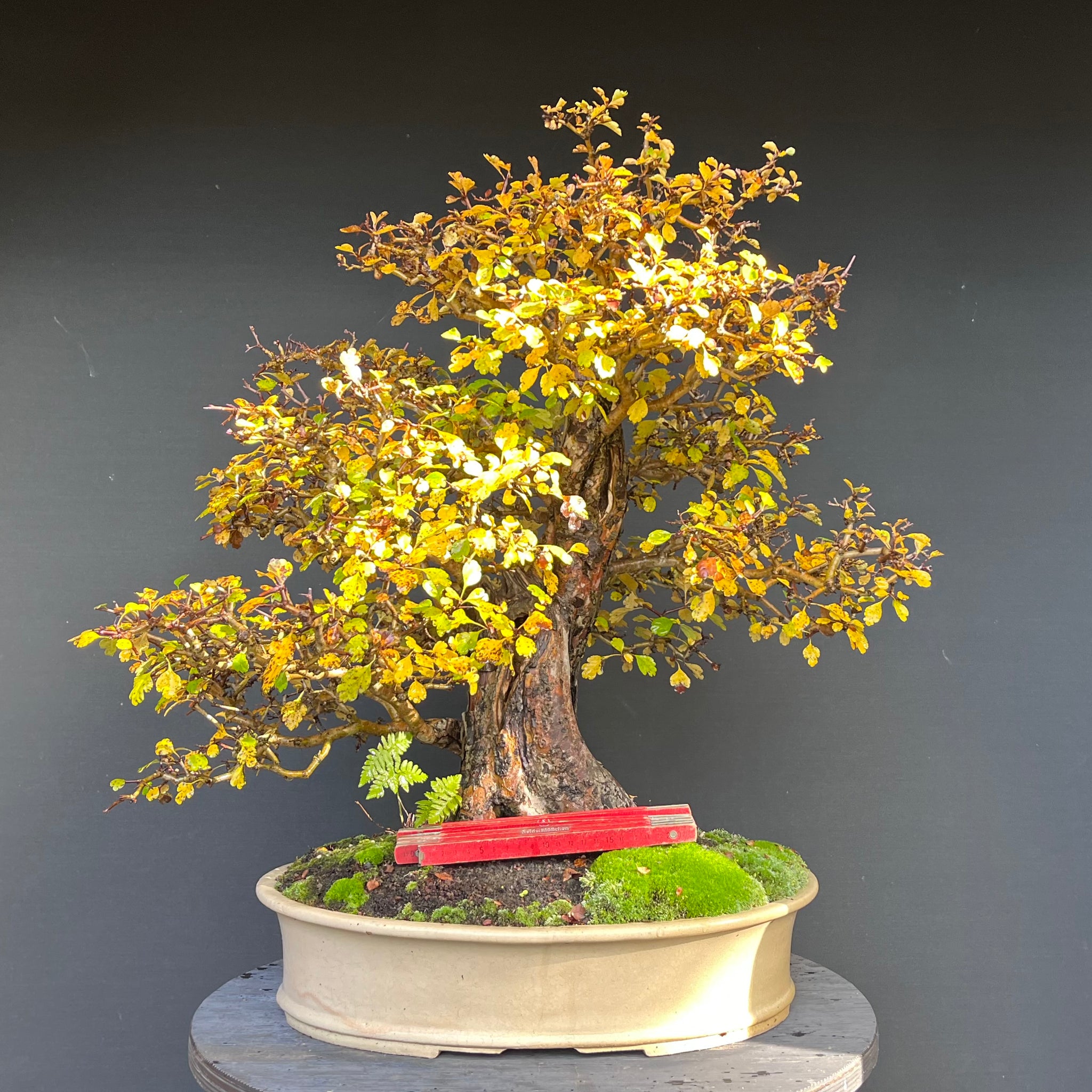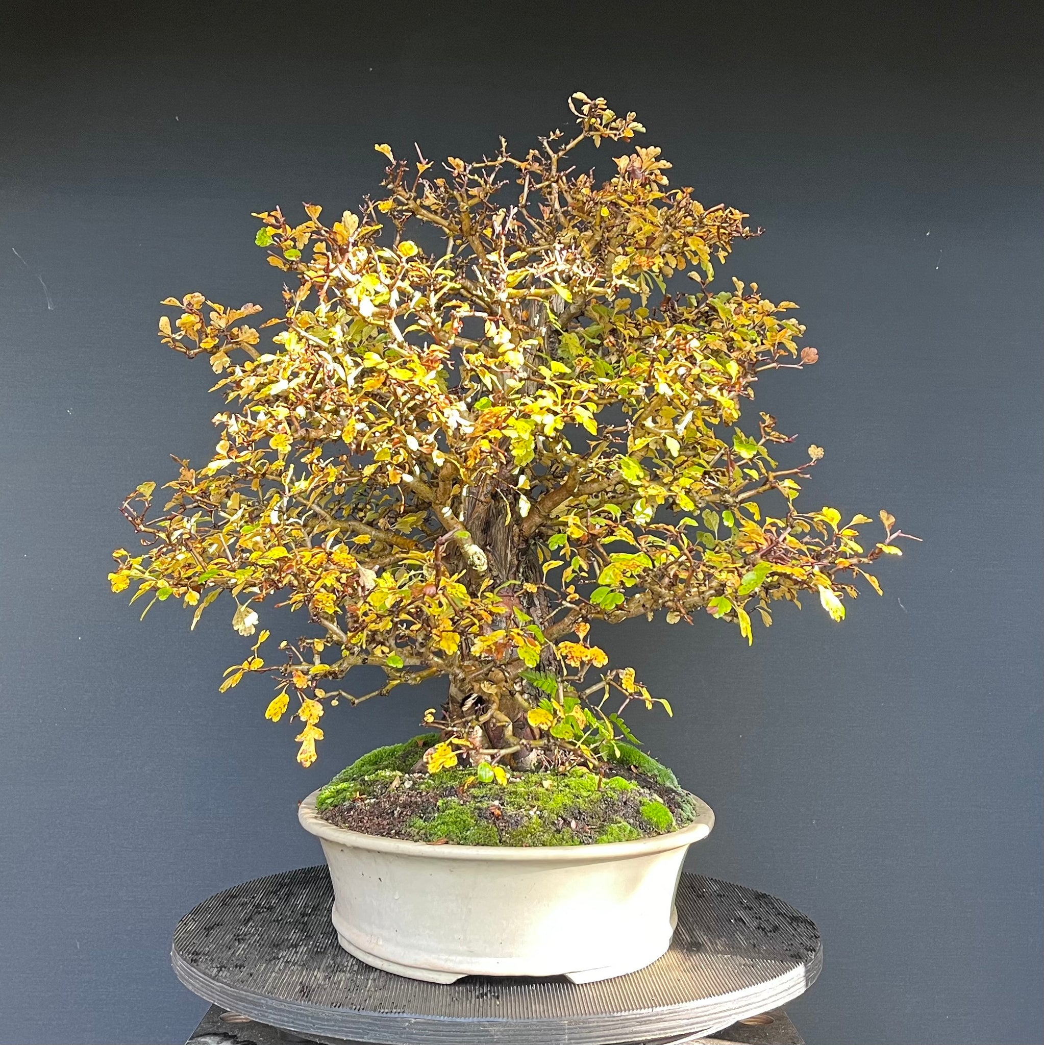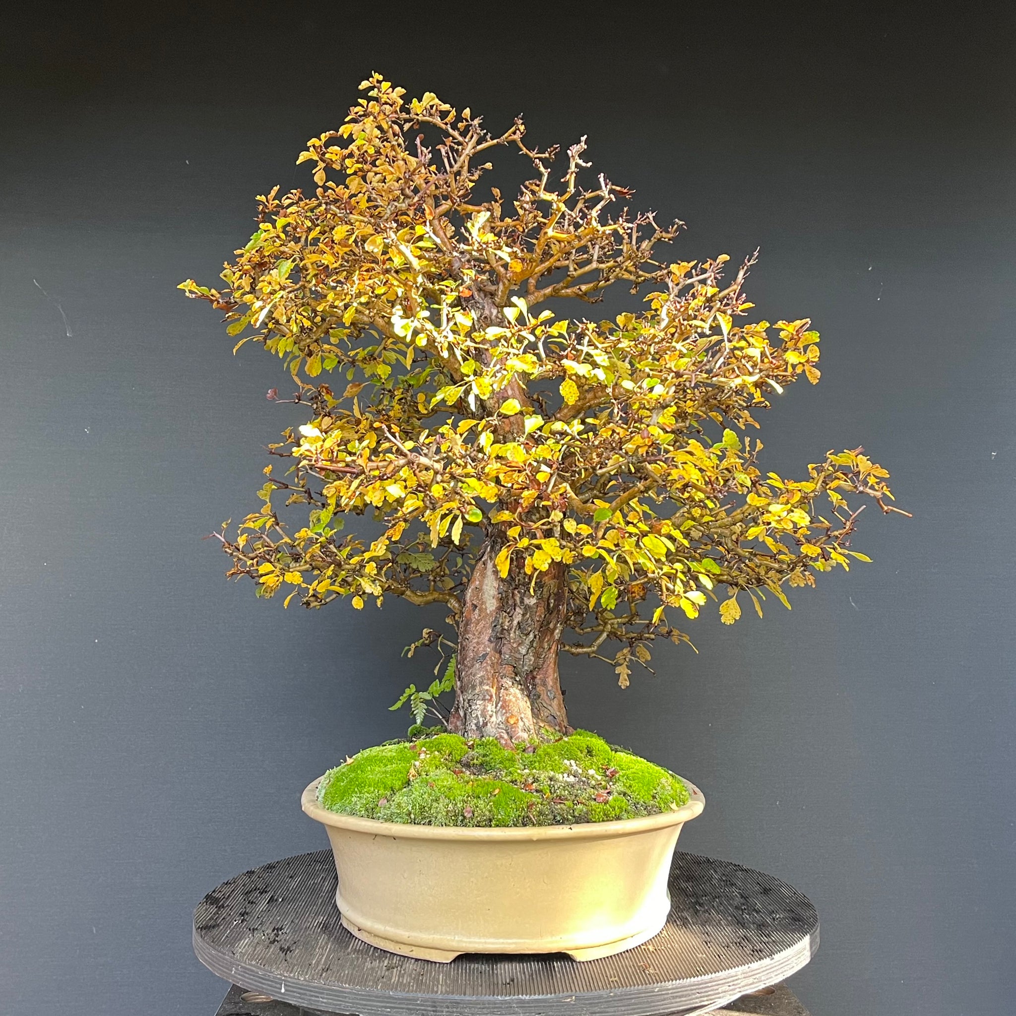 Dieser schöne reife Weißdorn-Bonsai hat einen kräftigen Stammansatz und nach oben hin eine elegante organische Bewegung. Es sind einige Totholzbereiche vorhanden, die bereits über Jahre bearbeitet wurden. Die Krone und die Verzweigung machen bereits einen sehr guten Eindruck, der Baum wirkt mächtig und beeindruckend. An einigen Stellen kann die Verzweigung noch weiter verfeinert werden.