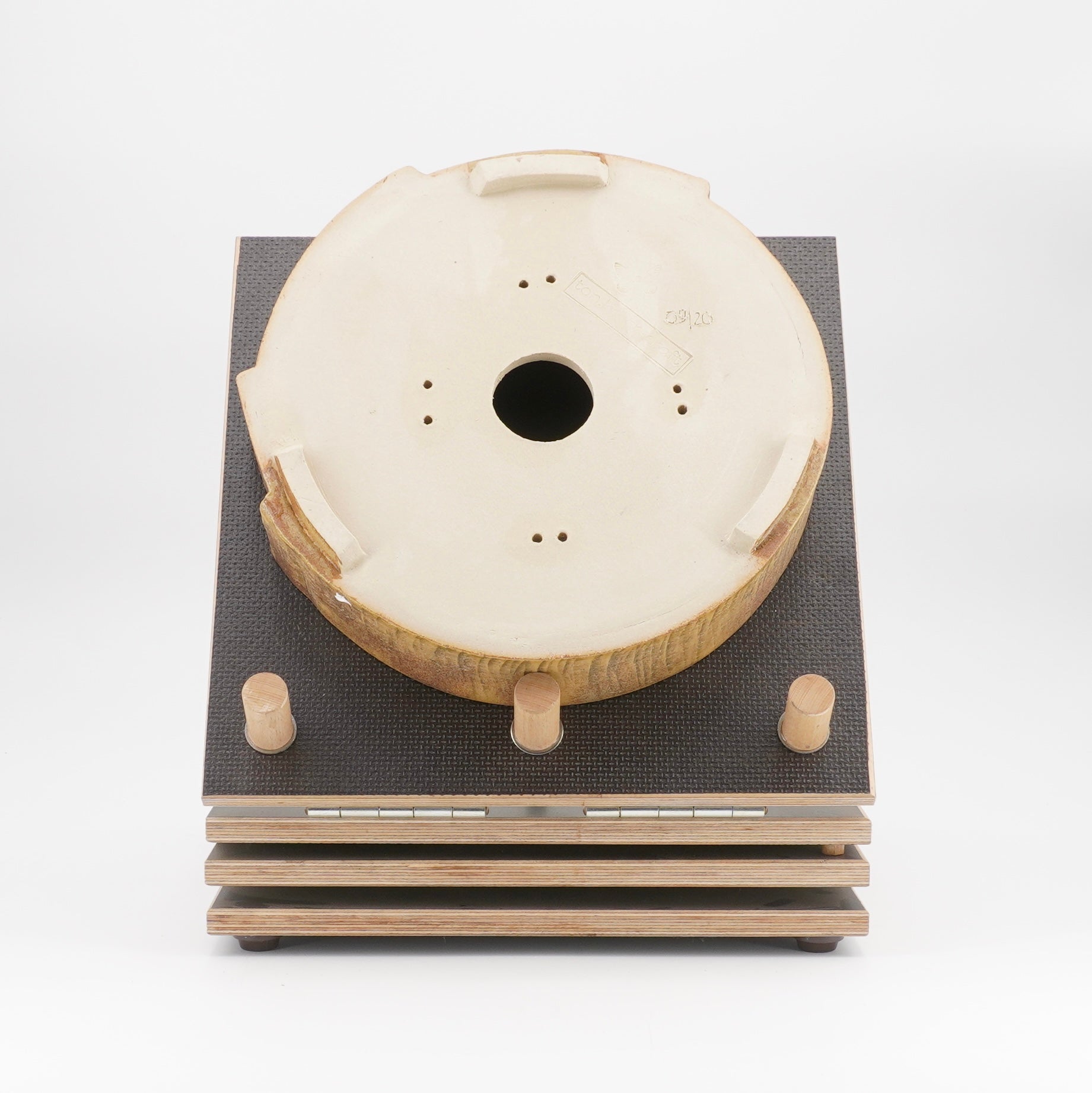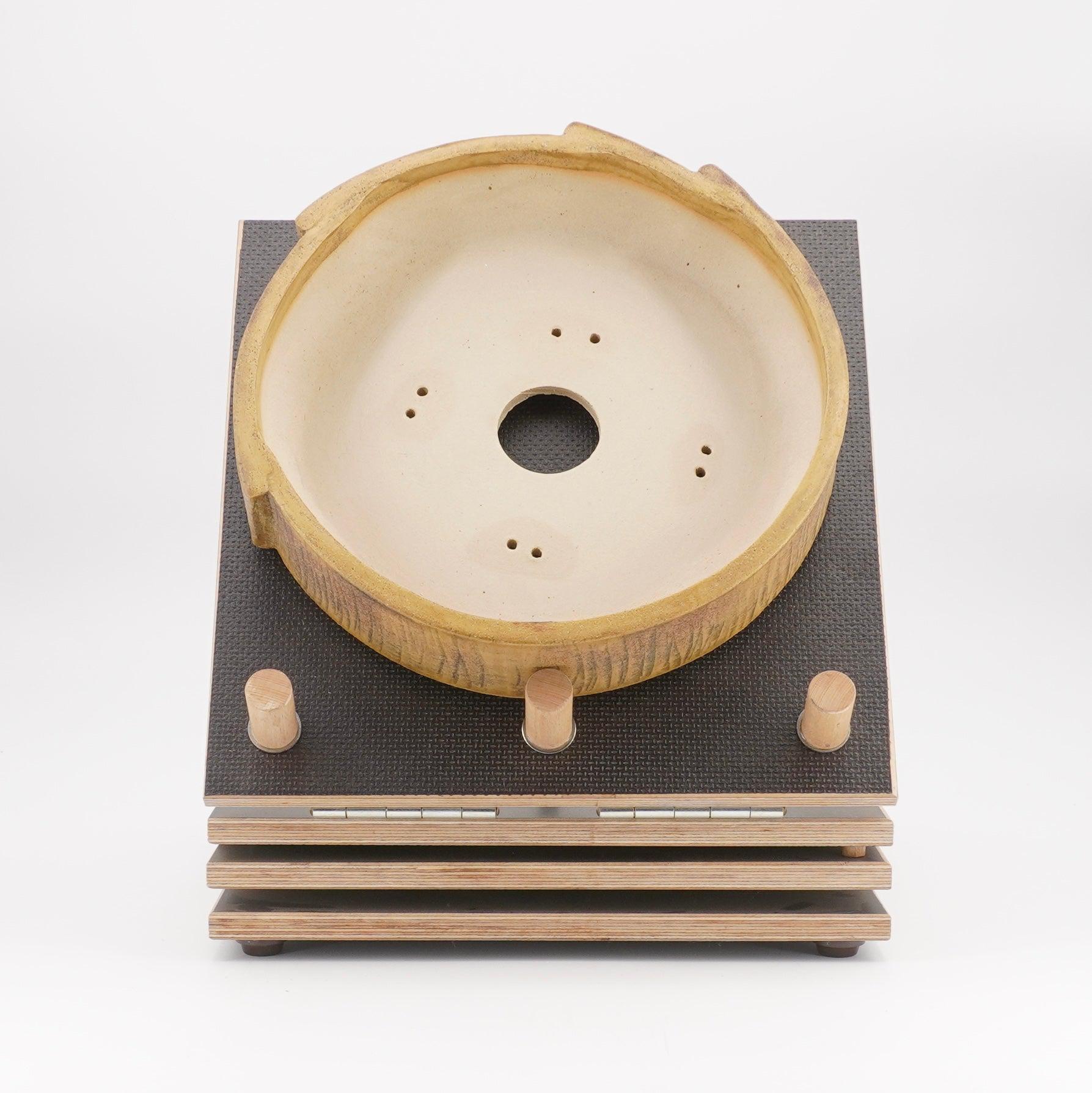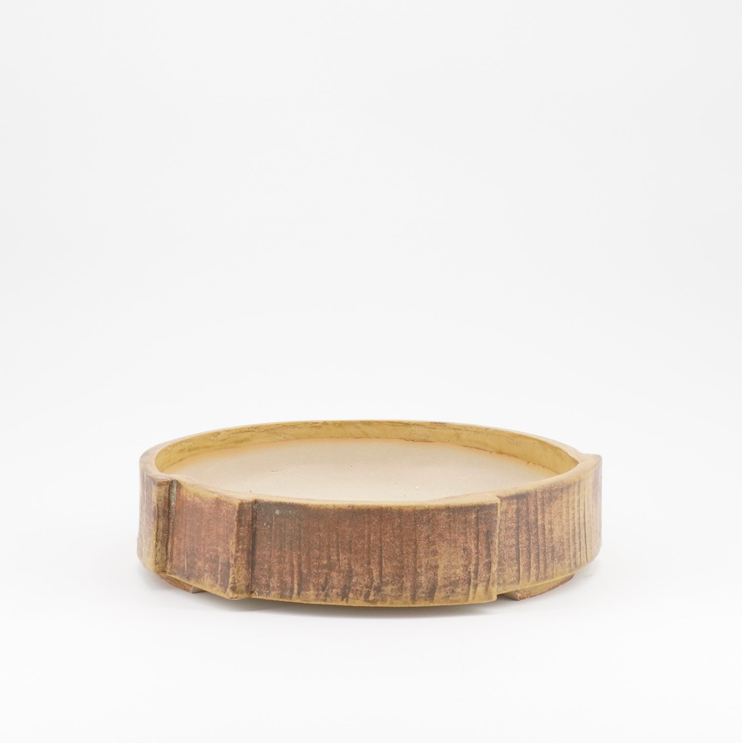 Runde Bonsaischale mit einer gemischten hell- und dunkelbraunen Glasur und mit interessanten überlappenden Rändern.