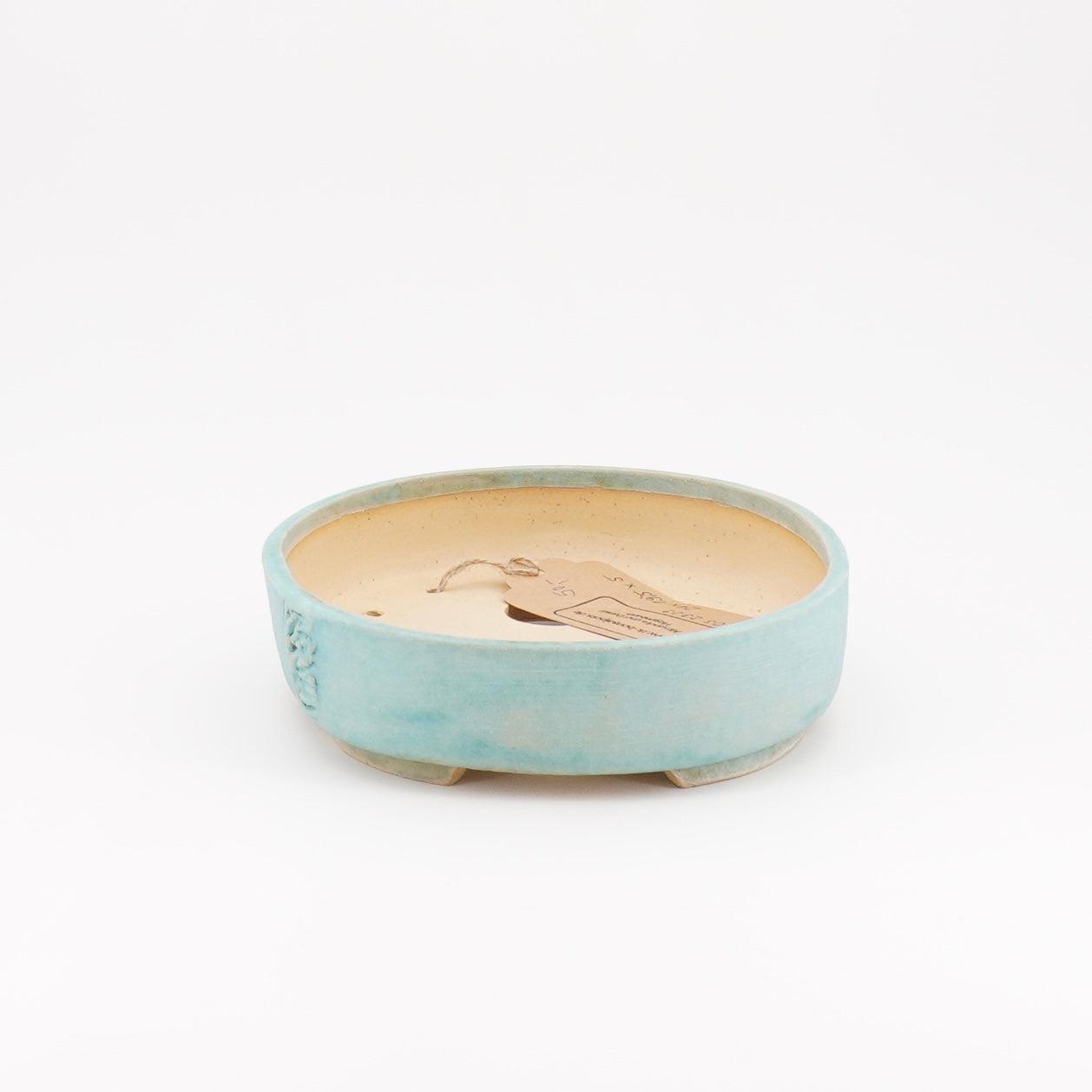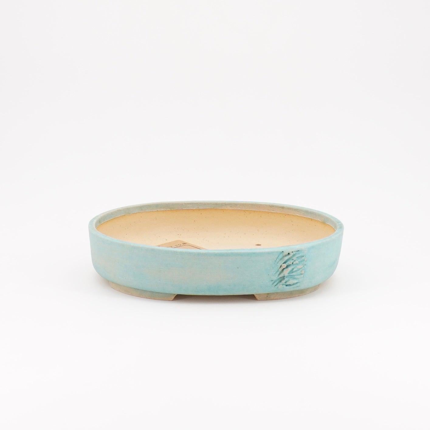 Kleinere ovale Bonsaischale mit schöner matter türkiser Glasur und einseitiger Applikation.