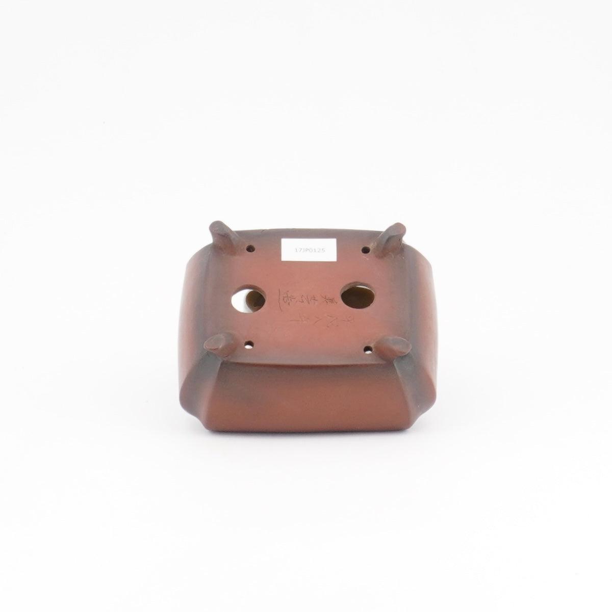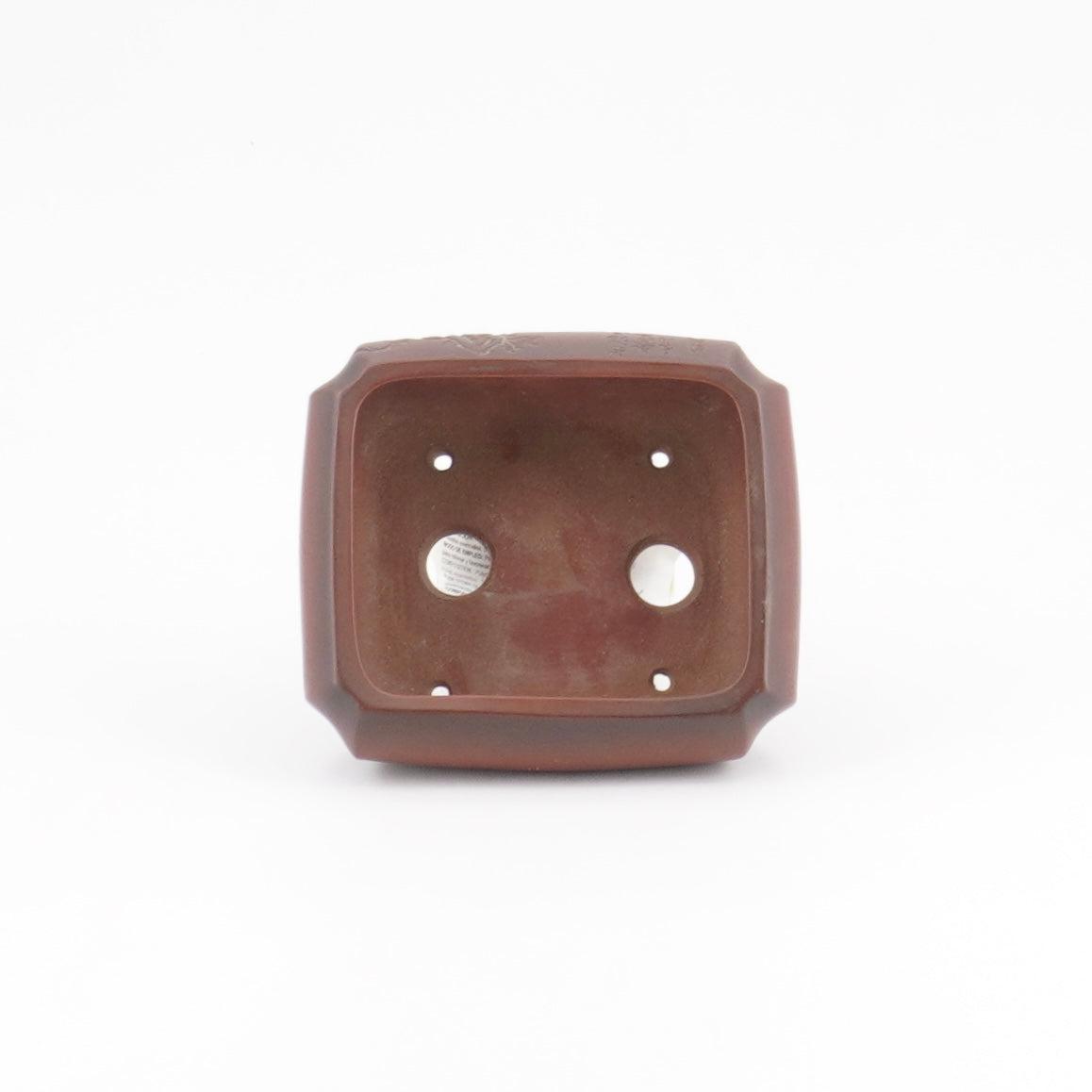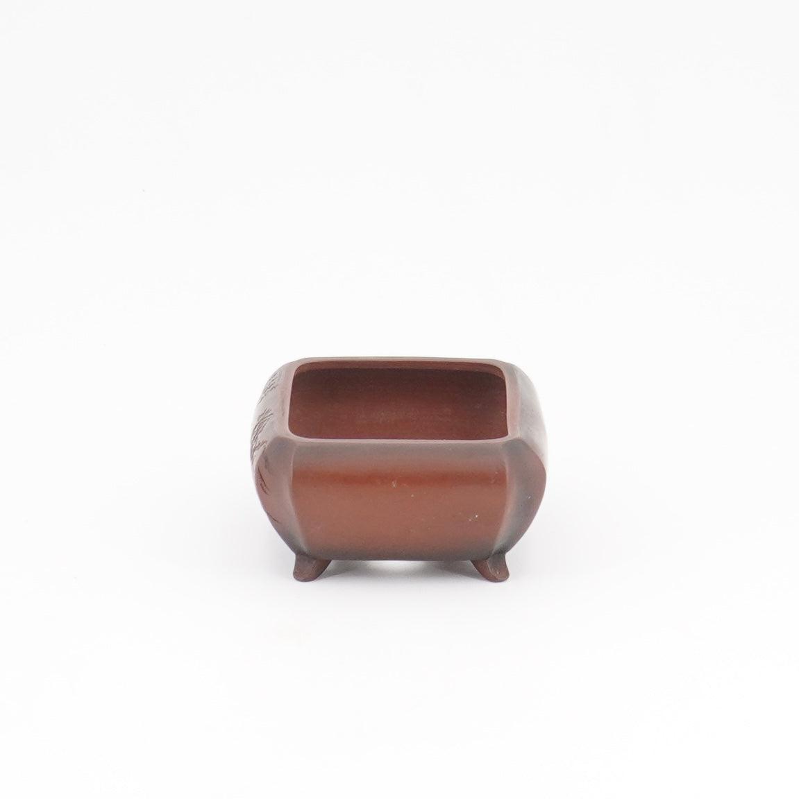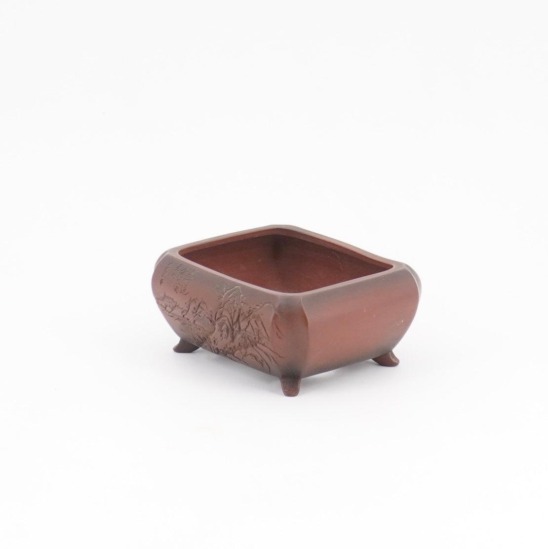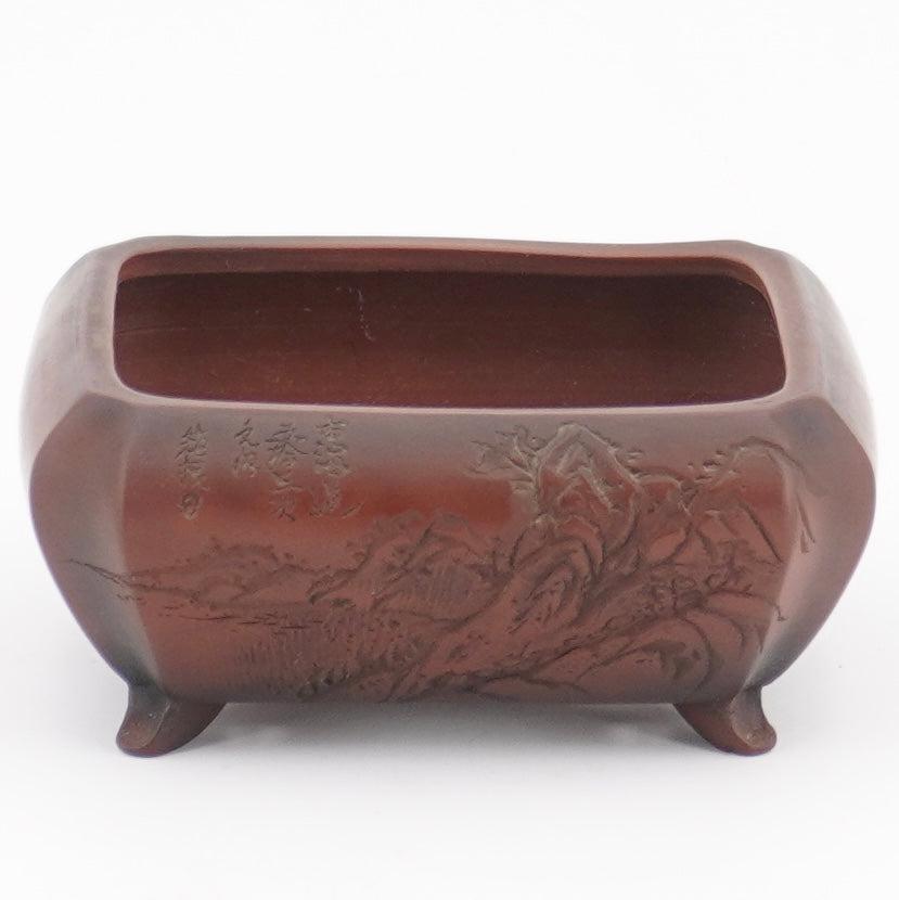 Tolle rechteckige "carved" Bonsai- bzw. Shohinschale von Bigei. Die Schale ist für ihn typisch in dem bekannten sehr feinen rotbraunen Ton hergestellt, der eine extrem weiche und feine Oberfläche hat. Die Schale hat eingezogene Ecken und auf der Vorderseite ist eine Landschaft eingeritzt. Die Schale ist ca. 25 Jahre alt und hat bereits eine gute Patina. Sie hat eine für Bigei untypische Signatur und war bisher Teil einer Sammlung. Eine seltene und tolle Schale!