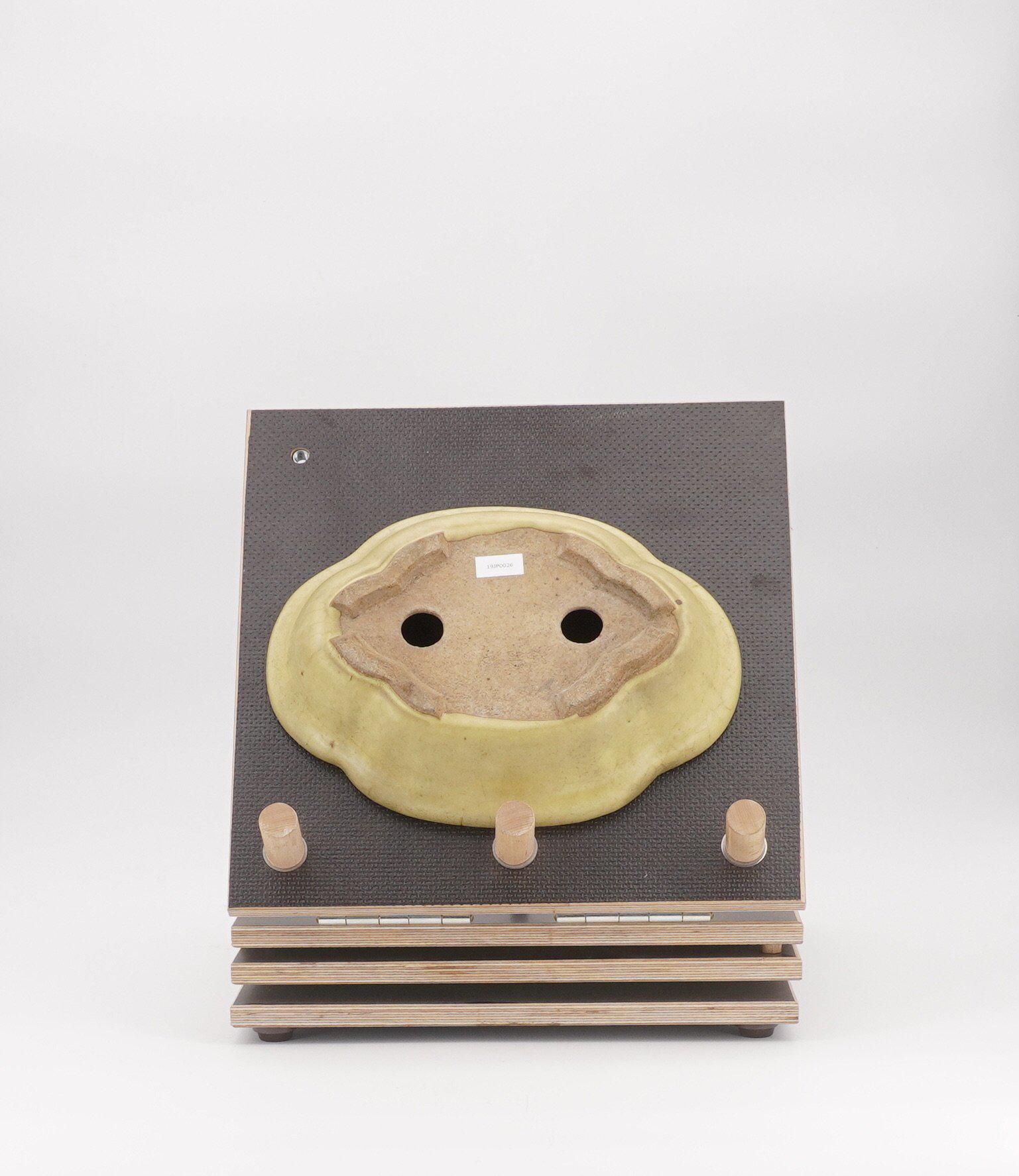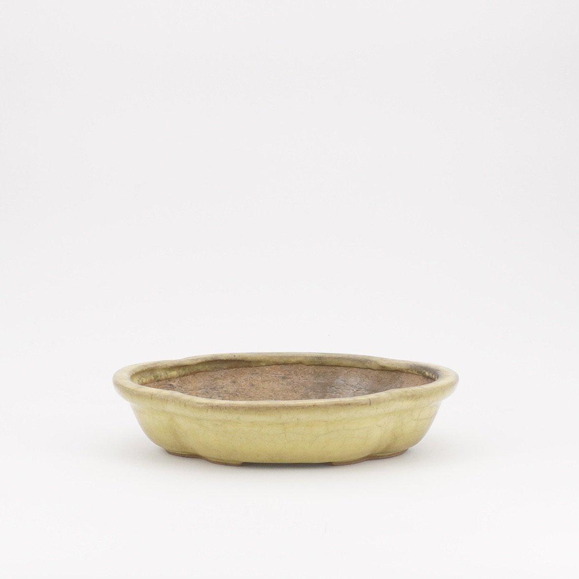 Gelbe Bonsaischale mit toller Patina von Hattori in Lotus-Form. Die Glasur hat zudem eine leichte Krakelé.