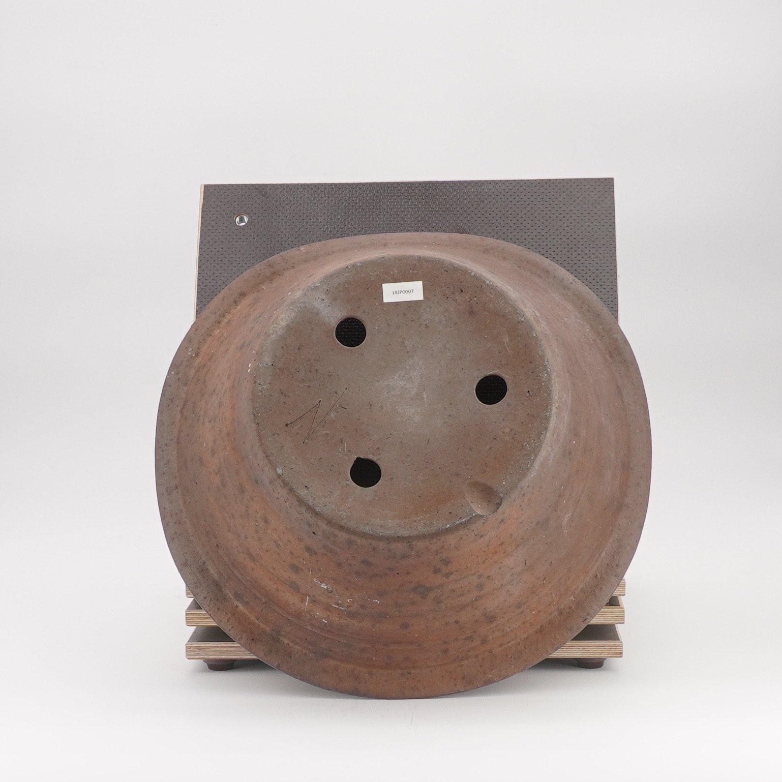 Organisch geformte runde Bonsaischale von Reihou aus rötlich braunem Ton und guter Patina. Die Schale wirkt sehr alt und rustikal. Kann für für Kaskaden aber auch für aufrechte Bäume genutzt werden.