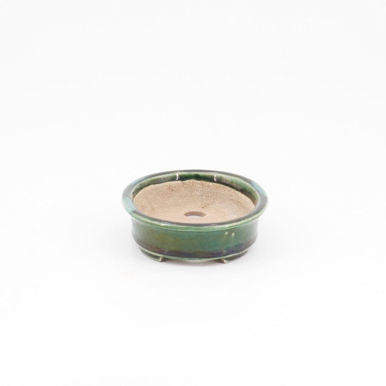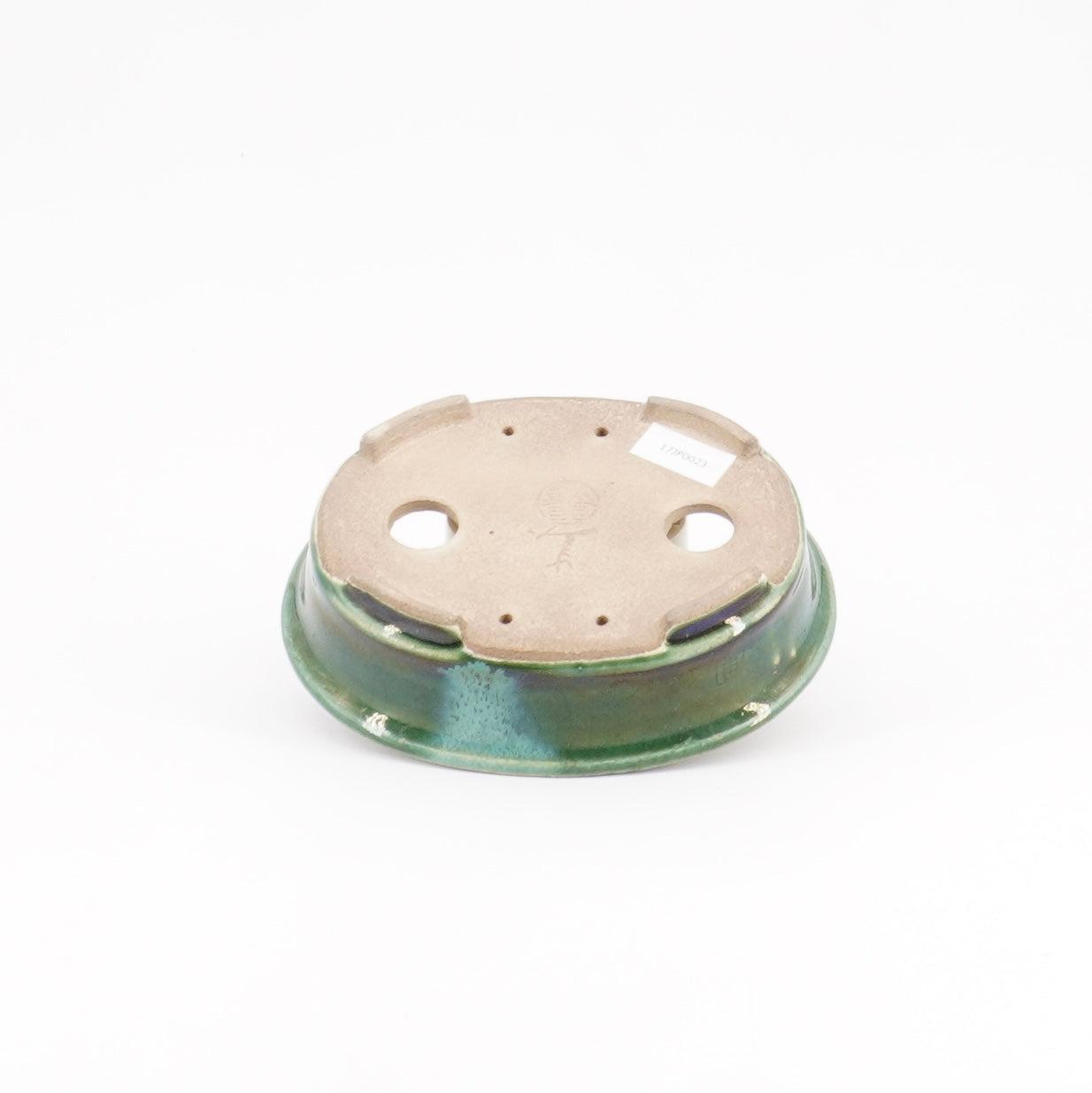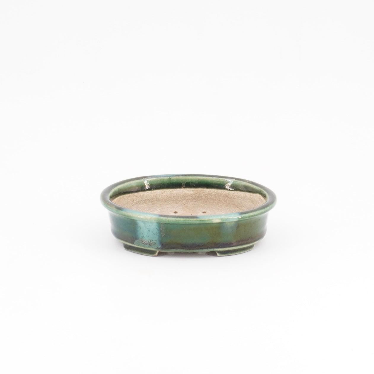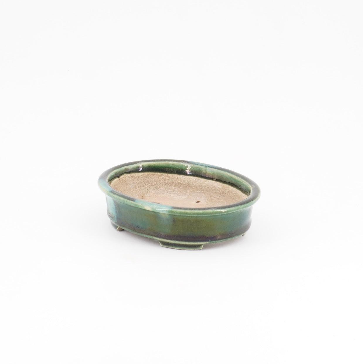 Schöne oval Bonsai- bzw. Shohinschale von Satomi Terahata aus Japan. Die Schale hat eine sehr schöne dunkelgrüne Glasur mit den typischen Verläufen. Sie ist makellos und ist perfekt für einen hochwertigen Shohin oder auch als schönes Sammlerstück.