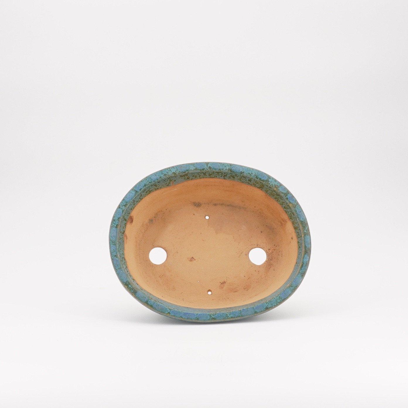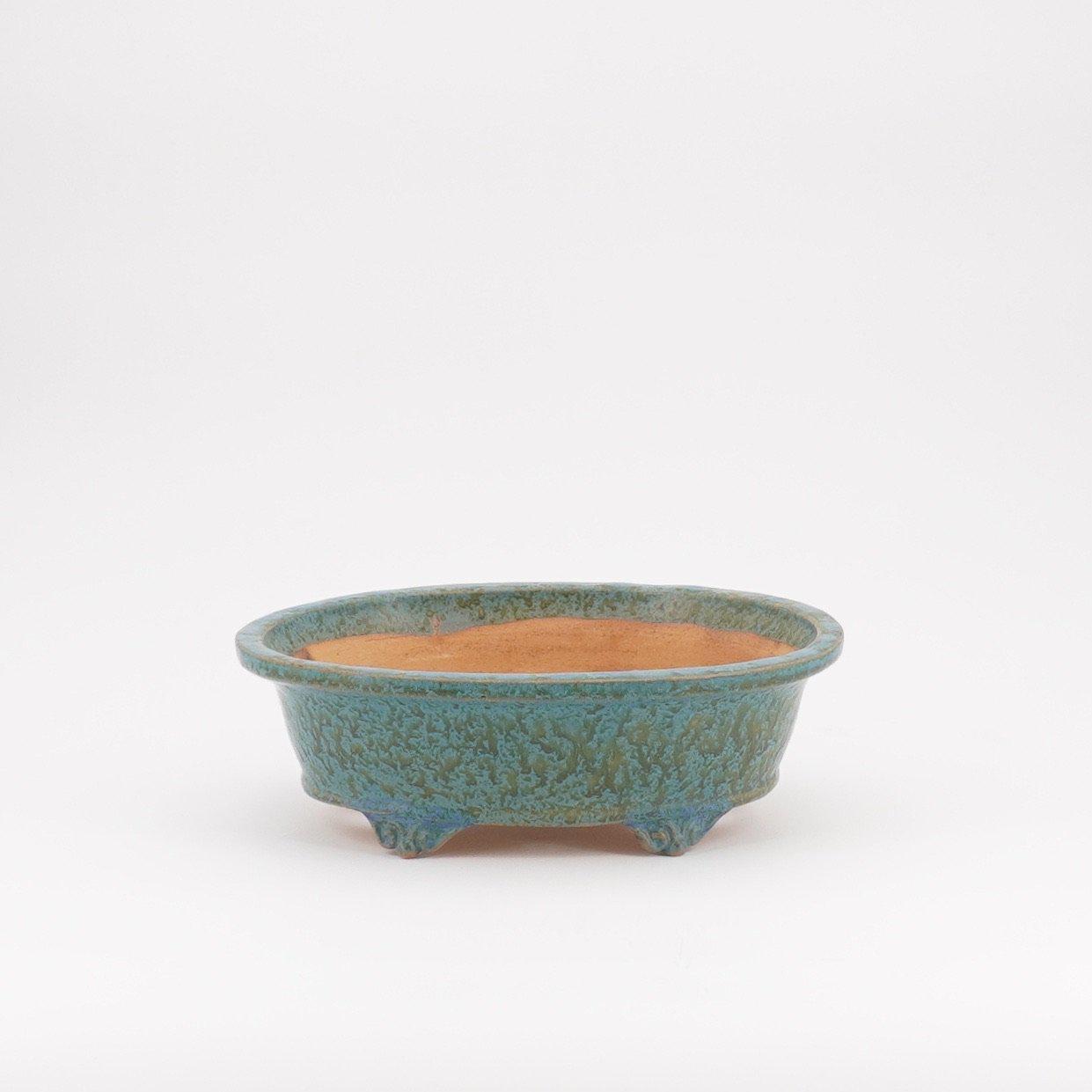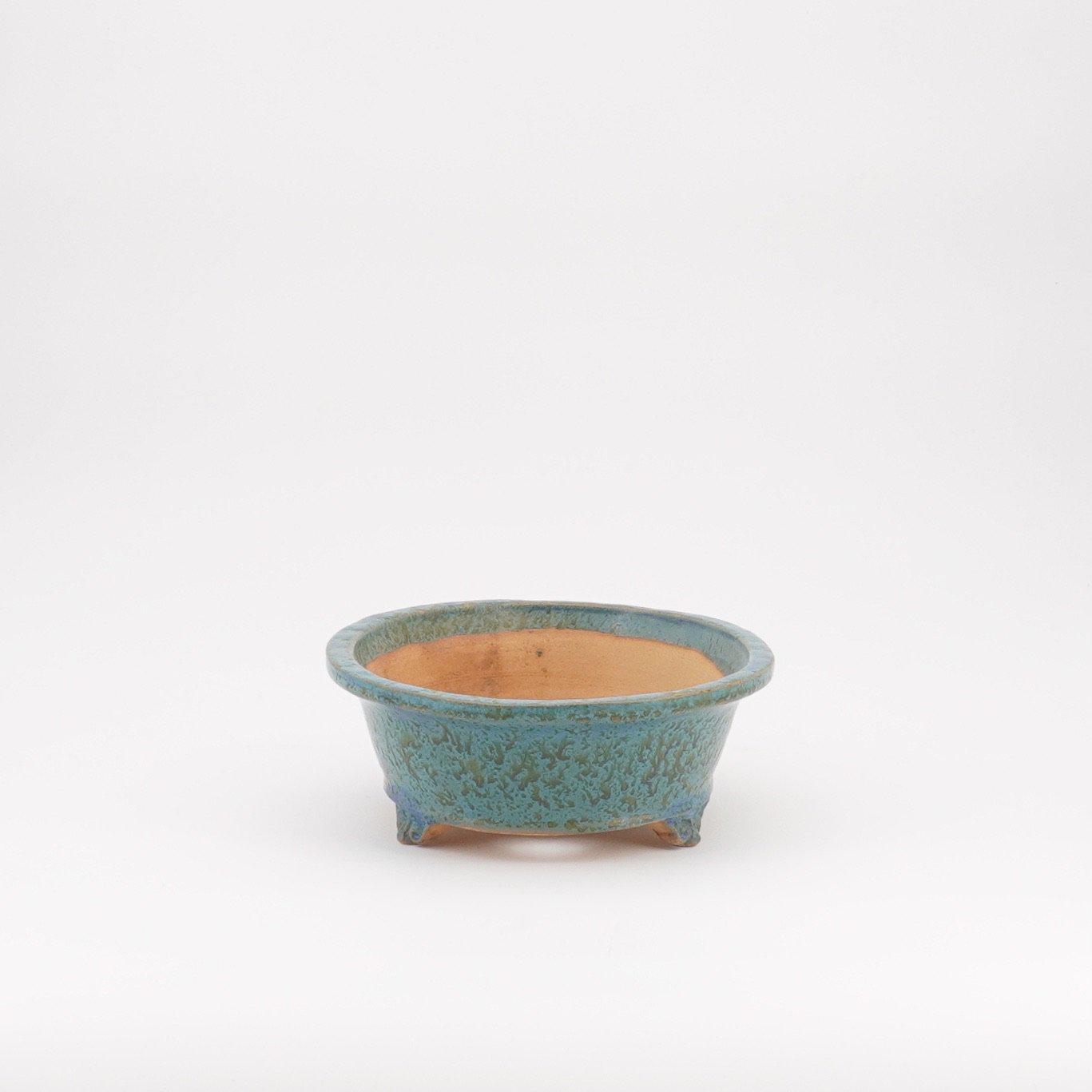 Wunderschöne kleinere Bonsaischale von Shuho in dunkel-geflecktem Türkis mit leichter Patina. Die Füße sind sehr schön gearbeitet und lassen die Schale leicht und filigran wirken.