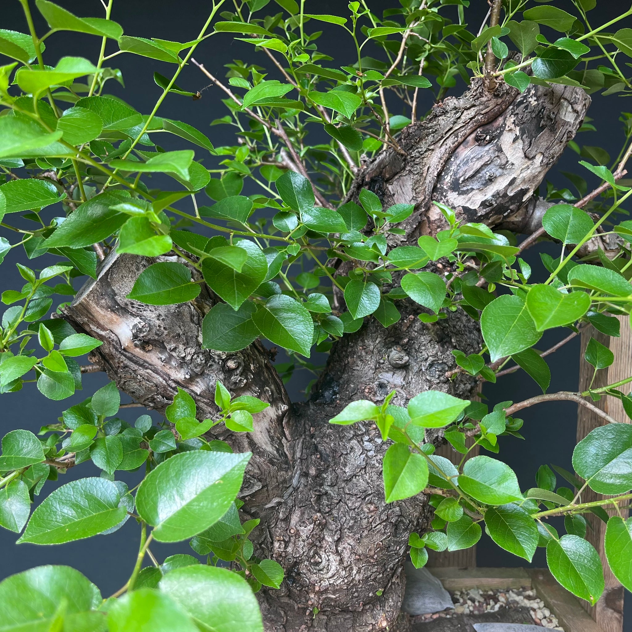 Alter Mahaleb-Yamadori mit einem massiven Stamm und toller Borke. Die Totholz-Bereiche lassen viel Spielraum für Totholzgestaltung, was in die zukünftige Entwicklung des Bonsai integriert werden kann. Die vielen Astansätze bieten viele Möglichkeiten für die Entwicklung der der Äste und der Krone.